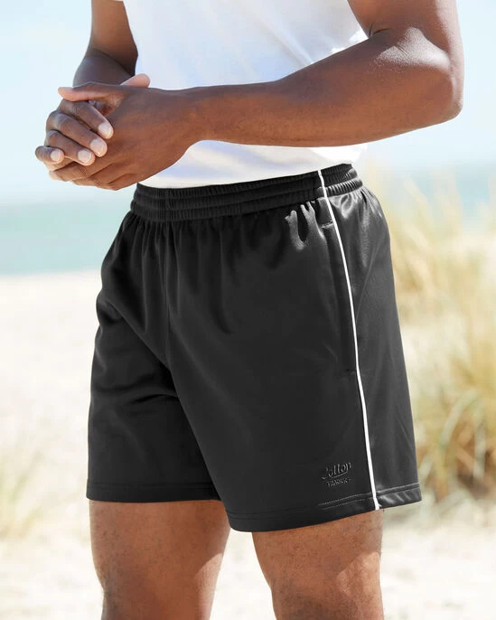 Whether you’re relaxing or ready to move, these sport-inspired shorts are perfect for wearing at home or packing into your gym bag. Lightweight and quick to dry, they’ve got a stretchy elastic waist and drawcord for the perfect fit. Finished with white piping to the seams, handy pockets and Cotton Traders embroidery to the leg. That’s easy comfort, sorted.Â