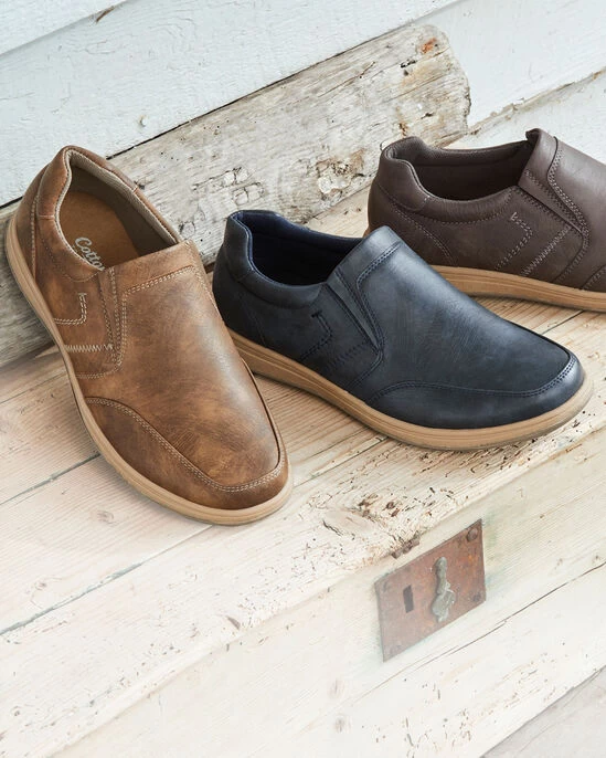 For easy summer styling, look no further than these casual slip-on shoes. The go-with-everything design features lightly brushed leather-effect uppersĀ with subtle, new season stitch detailing to give you bonus style points. Elasticated side inserts make them easy to slip on and off, and cushioned insoles promise all-day comfort.