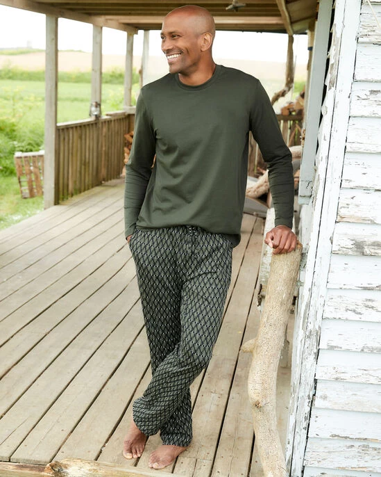 Soft cotton jersey was made for relaxing, so we think you’ll love this two-piece lounge set. Combining a long sleeved tee – with a classic and comfortable crew neck – with coordinating printed pants with a fully elasticated waistband, an adjustable drawcord, and pockets, this is the perfect choice for a cosy night in. Top length approx 29″ (74cm). Bottoms 29″ (74cm) inside leg.
