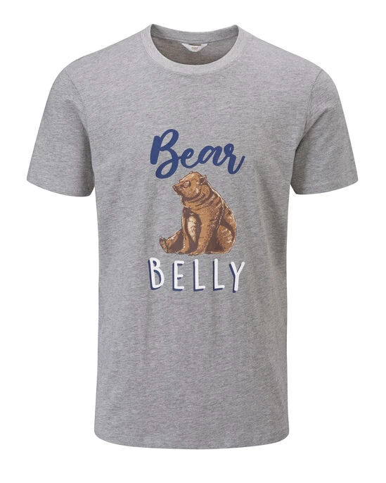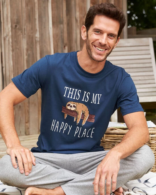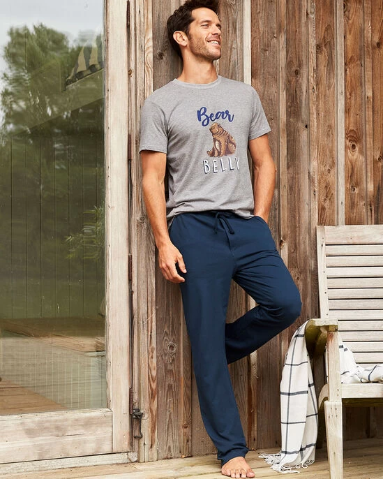 Relax in comfort with our soft jersey loungewear set. Featuring a choice of two exclusive print de-signs – Bear and Happy – they’re made from a soft cotton-blend fabric for ultimate comfort. Fea-turing a classic ribbed crew neckline and short sleeves, the co-ordinating trousers have a button fly fastening and an elasticated drawcord waist for the perfect fit, and all-essential side pockets to stow away your phone and the odd snack!