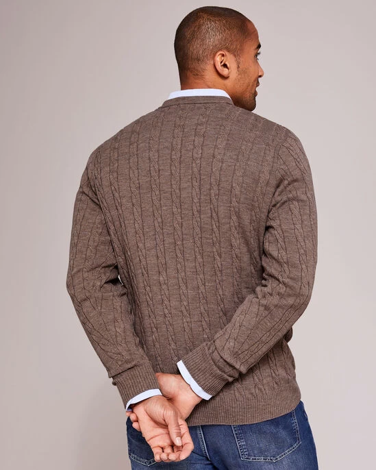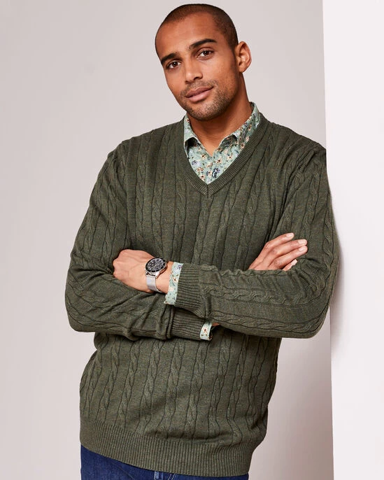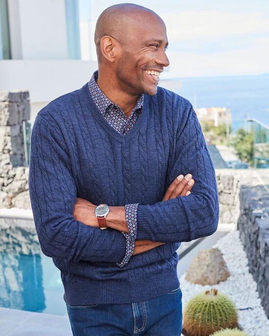 As soft as cashmere but completely effortless to care for, our cable knit jumper adds a little bit of luxury to your wardrobe. With all-over cables and a classic V-neck, it’s so soft and versatile that you’re going to find yourself reaching for it day after day, so we’ve made sure it’s machine washable so you can. Not only that, but it also comes in a choice of soft marls that complement our shirt collection perfectly. Even better, long sleeves and ribbed trims to the neck, hem and cuffs give it a comfortable fit that makes layering easy.Â
