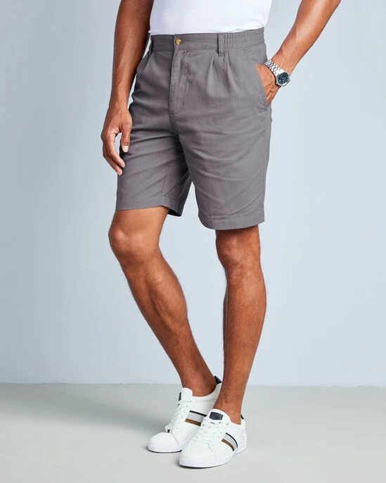Smart-casual style meets easy comfort in these pleat-front shorts. Essential for sunnier days, their prewashed pure cotton fabric has an irresistibly soft-peached finish, while the elasticated waist leaves plenty of room for comfort and movement. We’ve finished their relaxed styling with a zip fly and button fastening, slant pockets to the front and a button-fastening welt pocket to the back.