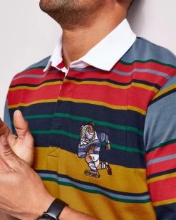 Your rugby shirt collection deserves some new stripes, so treat yourself to this wearable short sleeve shirt and its classic yarn-dyed stripe design in bold, stand-out colours. Featuring our exclusive Bulldog mascot embroidery, itβs crafted from heavy cotton jersey and features a contrast twill collar, white rubber buttons and Cotton Traders embroidery to the sleeve.