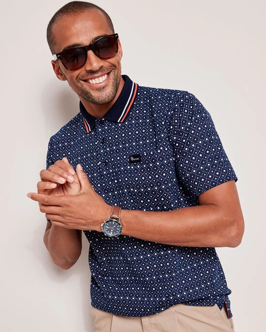 A classic short sleeve polo shirt in an all-over geometric print with lots of thoughtful finishing touches. The cotton jersey fabric feels fantastic and is designed to be soft, strong and breathable, while clever touches such as the smart anti-curl collar keep you looking sharp. We’ve added a chest pocket with a woven rugby tab and Cotton Traders embroidery to the sleeve for some personalised distinction.