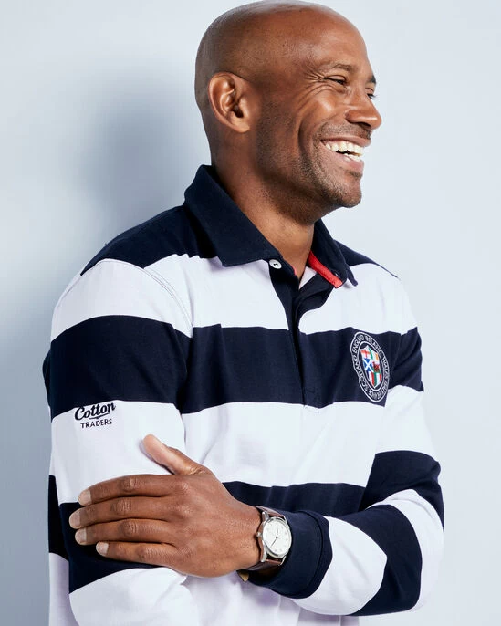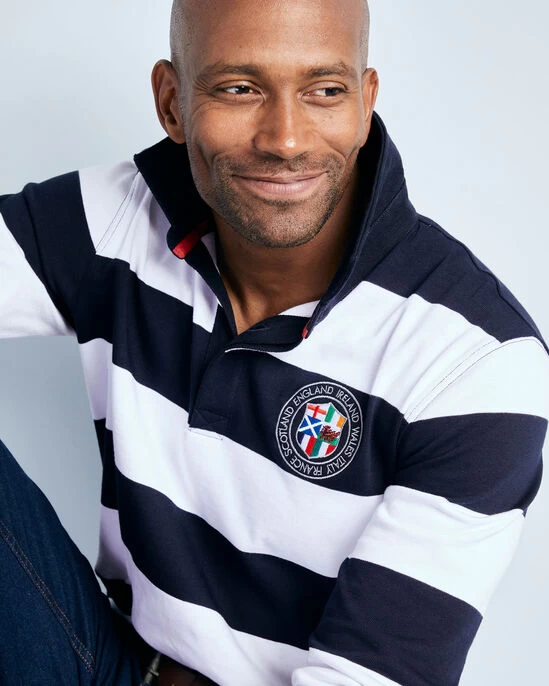Show your support for the Six Nations with our navy and white hooped rugby shirt. In pure cotton, it’s got comfort and breathability locked in, while the graduated yarn-dyed hooped stripes, twill stand collar with concealed placket and traditional rubber buttons give it an authentic rugby finish. Whether you’re in the throws of Six Nations excitement or relaxing during the off-season, support your nation with the embroidered Six Nations chest emblem.